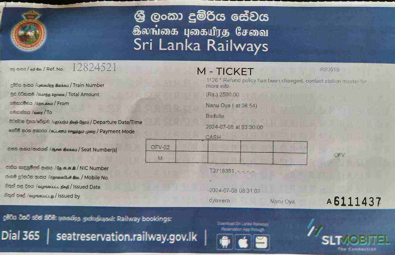 If the ticket booking is made through our regular method (physically visiting a railway station), we can deliver the printed ticket to your home country (by air mail) or to your preferred hotel (where you'll stay after arrival in Sri Lanka) via local courier service.
